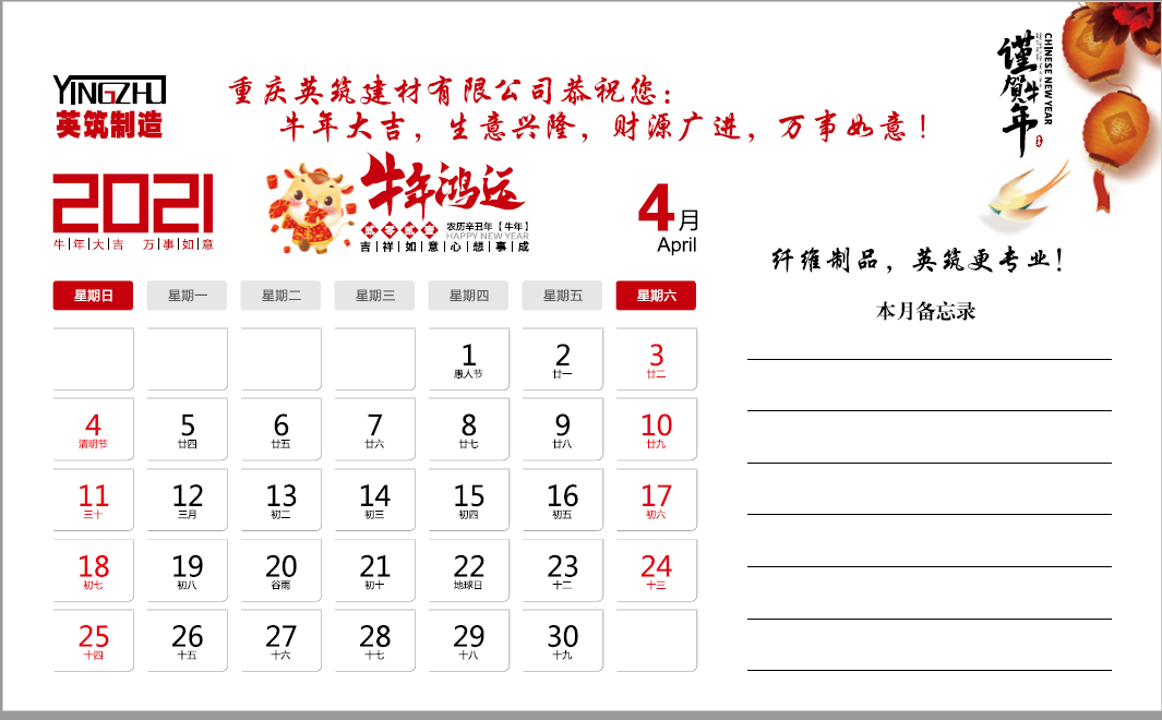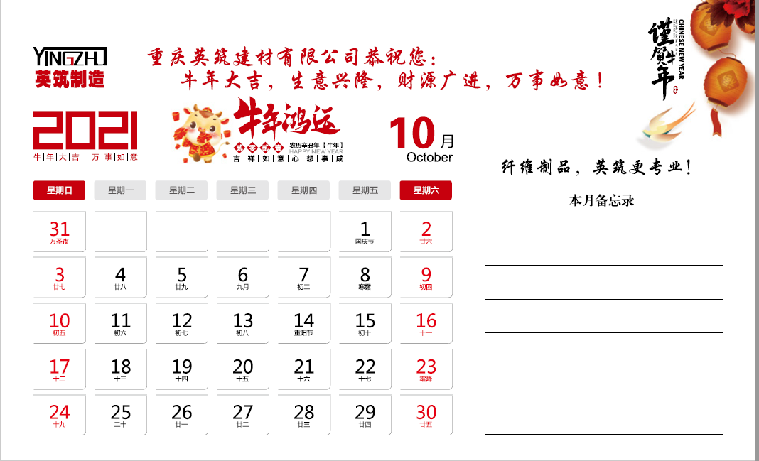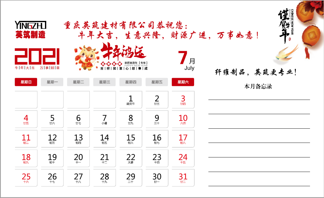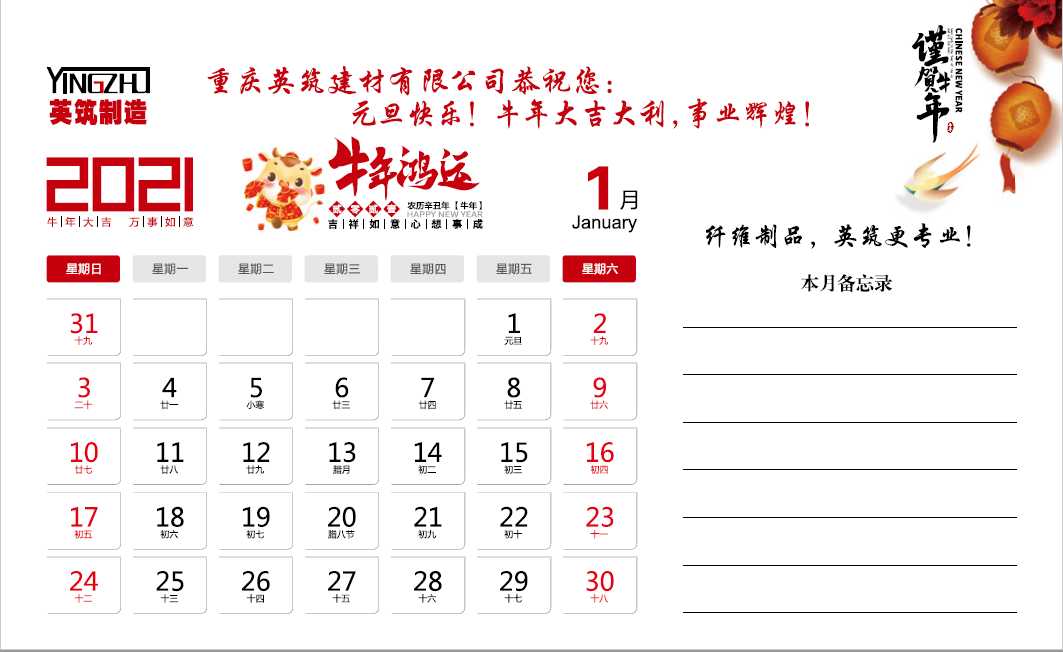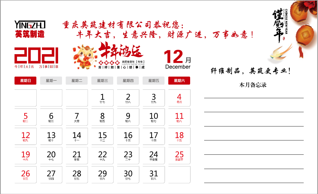 尊敬的各位領(lǐng)導(dǎo)和朋友們:重慶英筑纖維公司“2021新年臺(tái)歷”已經(jīng)于2020年12月23日開始寄發(fā)和派送,敬請大家注意查收。